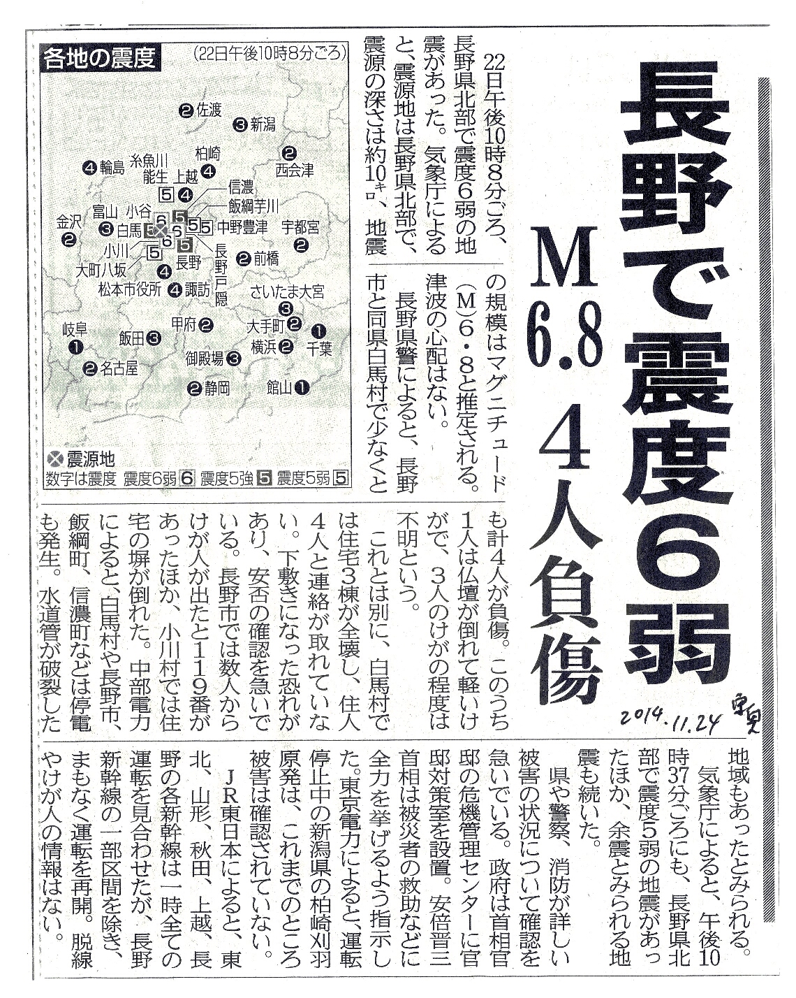 [2014_11_24_01]長野で震度6弱 M6.8 4人負傷(東奥日報2014年11月24日)