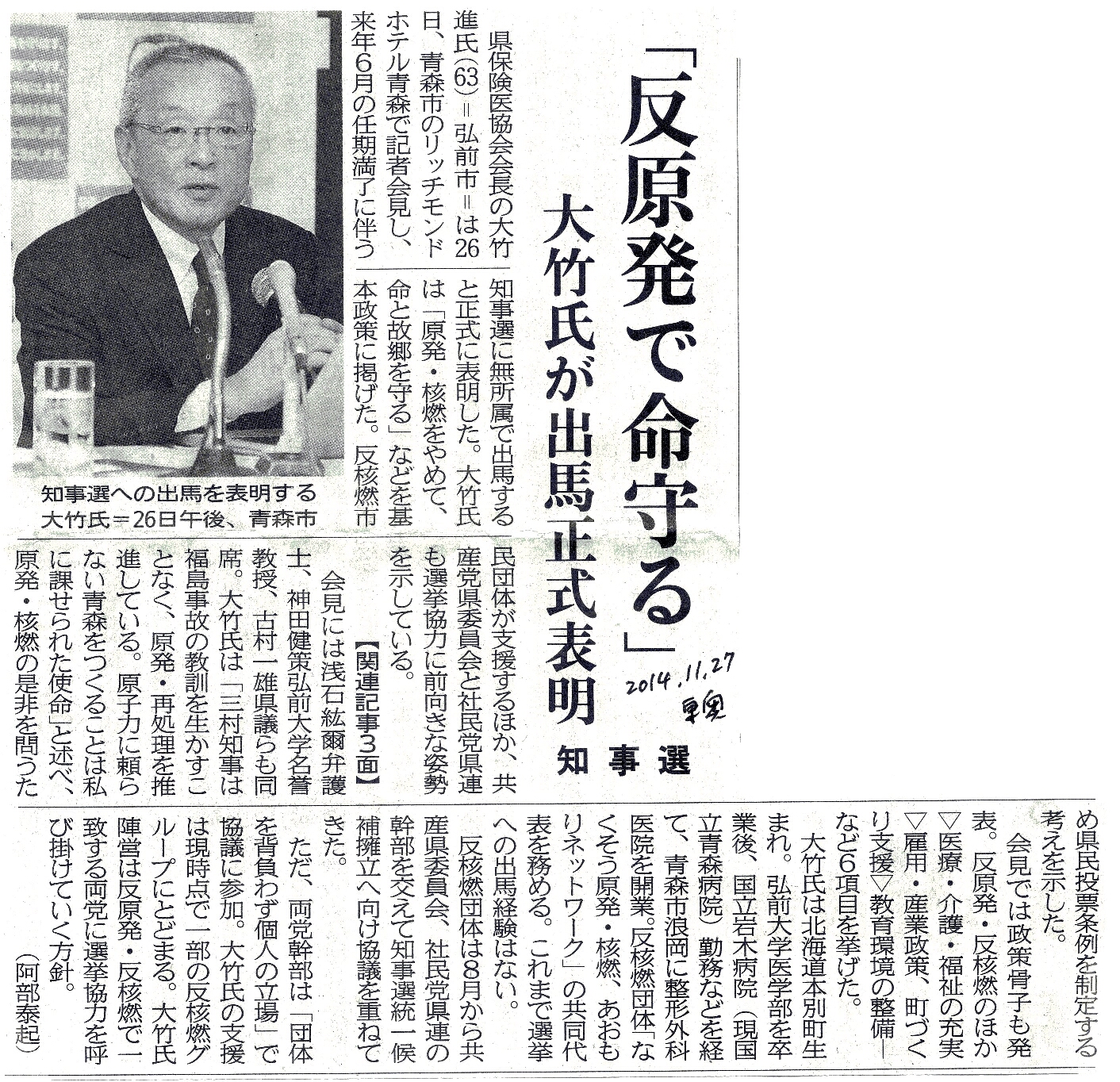 [2014_11_27_01]「反原発で命まもる」 大竹氏が出馬正式表明 知事選(東奥日報2014年11月27日)