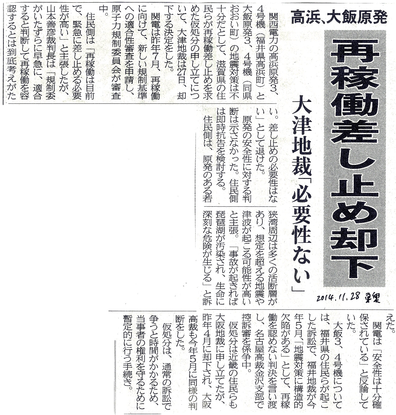 | [2014_11_28_02]高浜、大飯原発 再稼働差し止め却下 大津地裁「必要性ない」(東奥日報2014年11月28日) |
