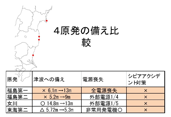 原発 津波への備え 電源喪失 シビアアクシデント対策 福島第一 × 6.1m→13m 全電源喪失 × 福島第二 × 5.2rn→−9m 外部電源1/4 × 女川 ○ 14.8m→13m 外部電源1/5 × 東海第二 △5.72m→5.3m 非常用発電機○ × |