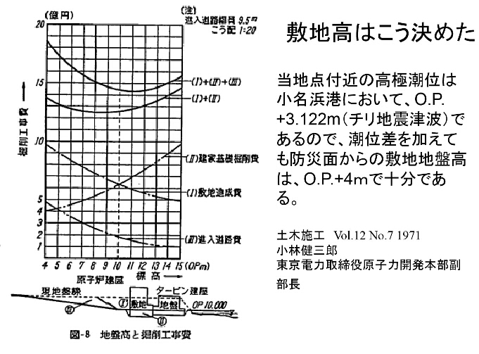 敷地高はこう決めた 当地点付近の高極潮位は 小名浜港において、0.P. +3.122m(チリ地震津波)で あるので、潮位差を加えて も防災面からの敷地地盤高 は、0.P.+4mで十分であ る。 土木施工 Vol.12 No.7 1971 小林健三郎 東京電力取締役原子力開発本部副部長 |