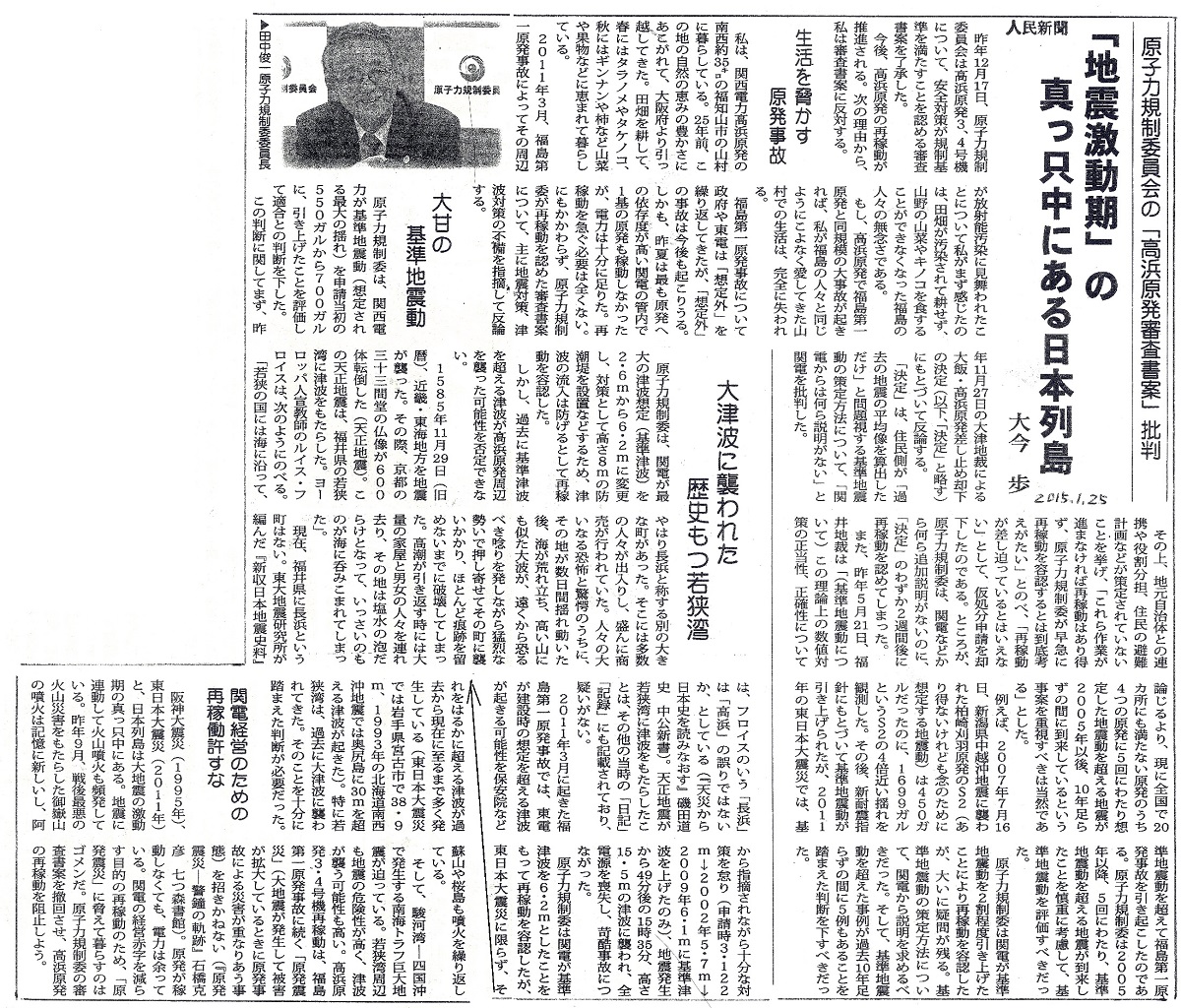 [2015_01_25_01]原子力規制委員会の「高浜原発審査書案」批判 「地震活動期」の真っ只中にある日本列島 大今 歩 生活を脅かす原発事故 大甘の基準地震動 大津波に襲われた歴史もつ若狭湾 関電経営のための再稼働を許すな(人民新聞2015年1月25日)