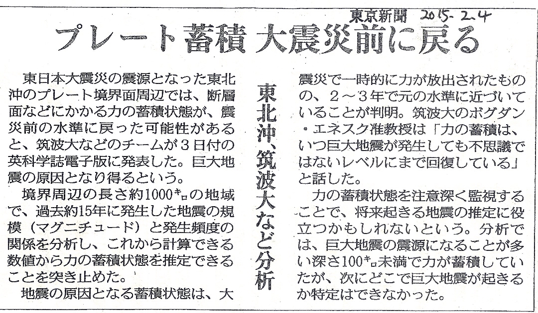 [2015_02_04_01]プレート蓄積 大震災前に戻る 東北沖、筑波大など分析(東京新聞2015年2月4日)