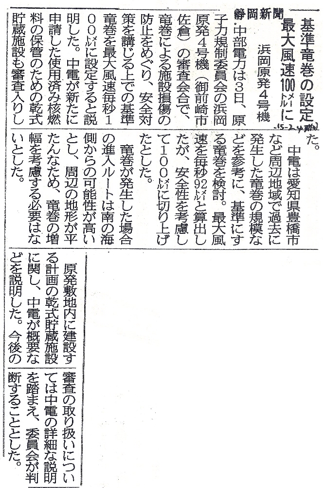 [2015_02_04_02]基準竜巻の設定 最大風速100メートルに 浜岡4号機(静岡新聞2015年2月4日)