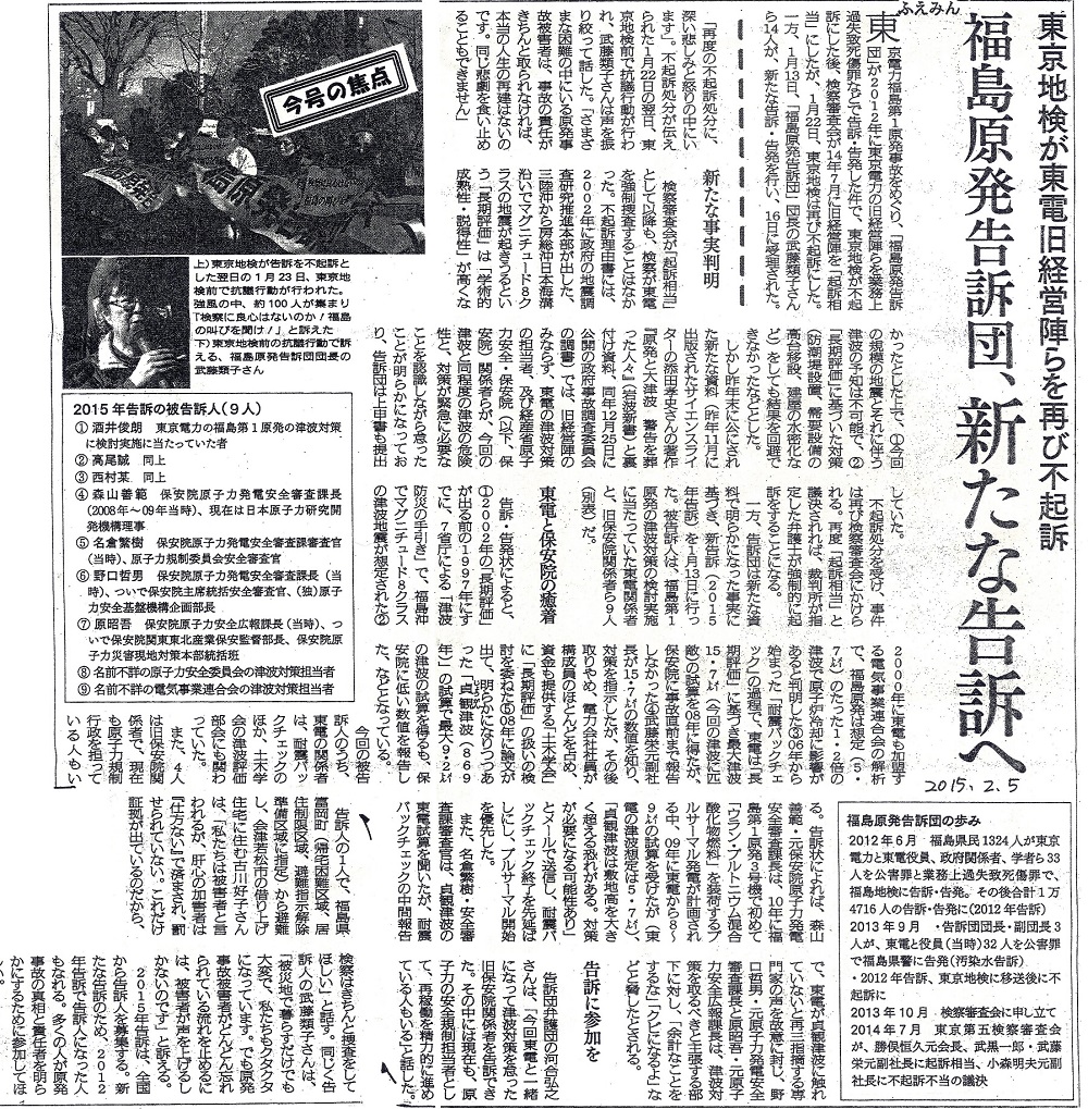 | [2015_02_05_01]東京地検が東電旧経営陣らを再び不起訴 福島原発告訴団、新たな告訴へ(ふえみん2015年2月5日) |