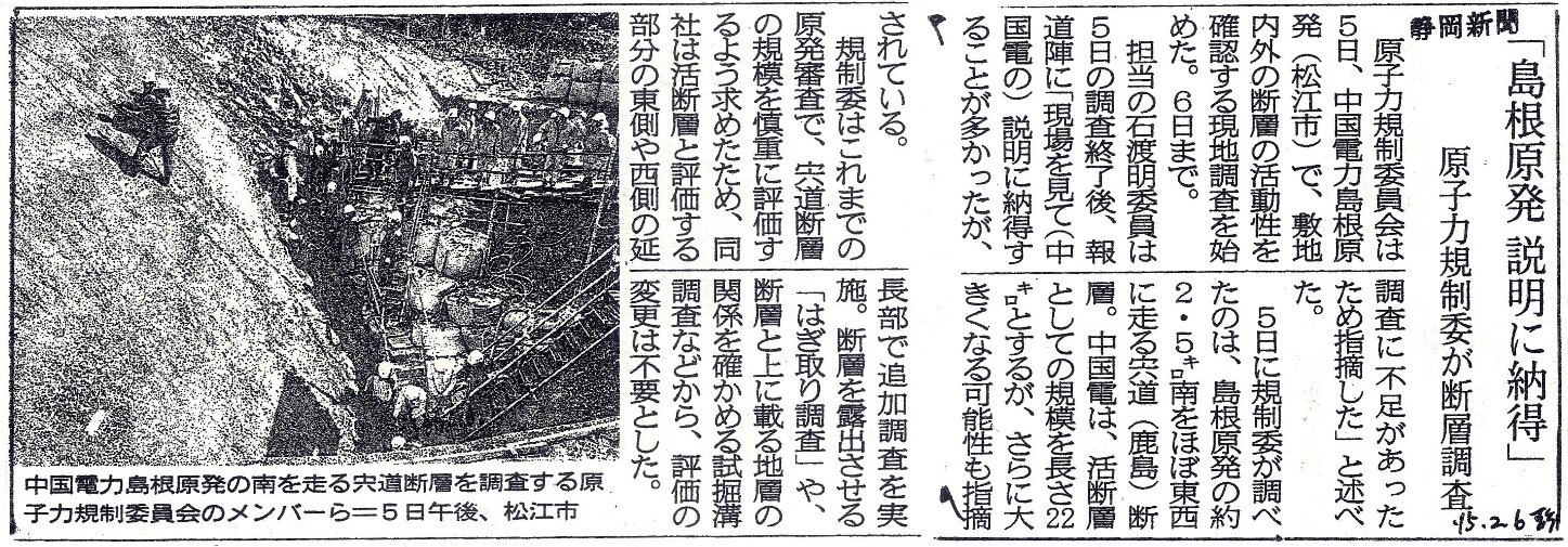 [2015_02_06_01]「島根原発 説明に納得」 原子力規制委が断層調査(静岡新聞2015年2月6日)