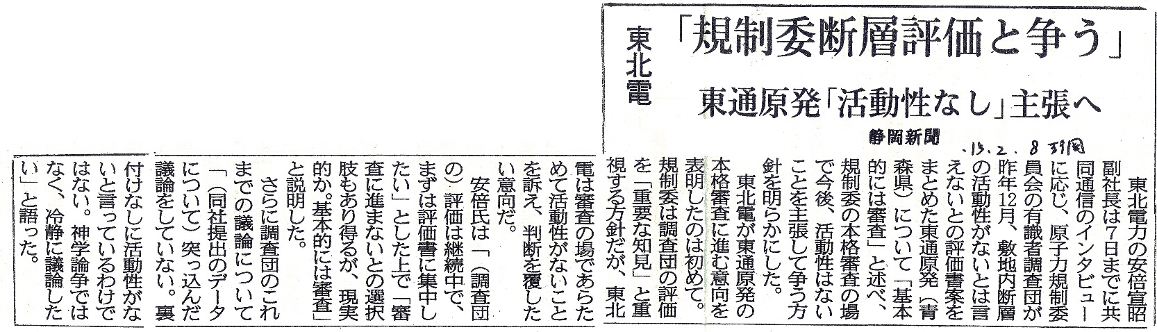 | [2015_02_08_01]東北電 「規制委断層評価と争う」 東通原発「活動性なし」主張へ(静岡新聞2015年2月8日) |