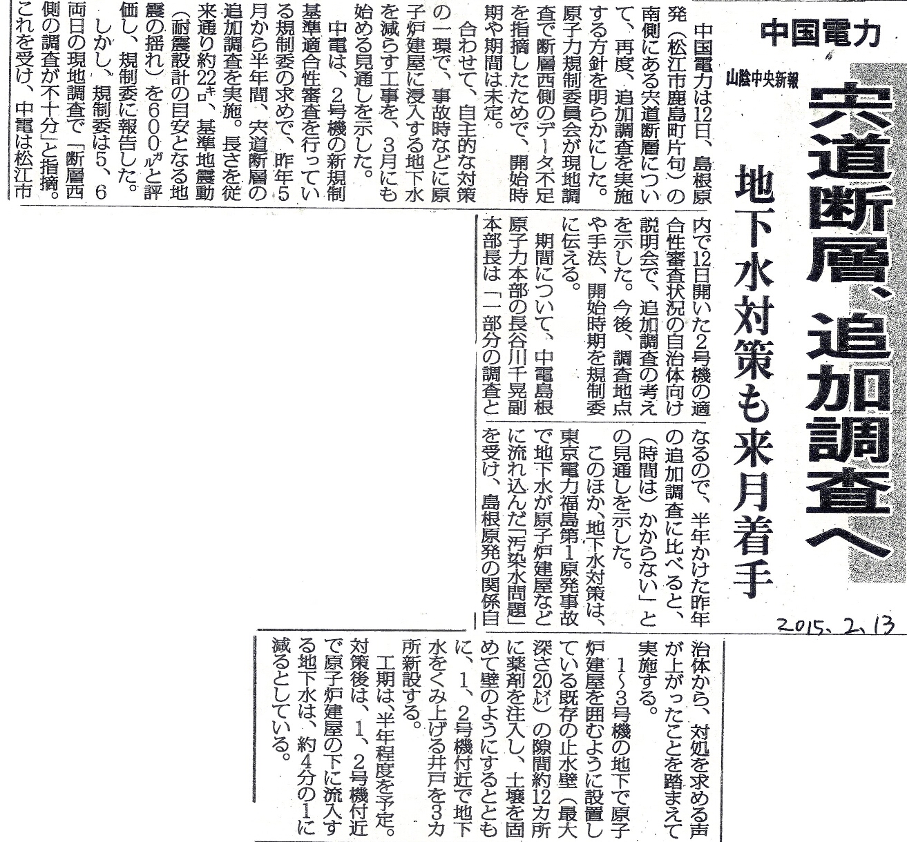 [2015_02_13_01]中国電力 宍道断層、追加調査へ 地下水対策も来月着手(山陰中央新報2015年2月13日)