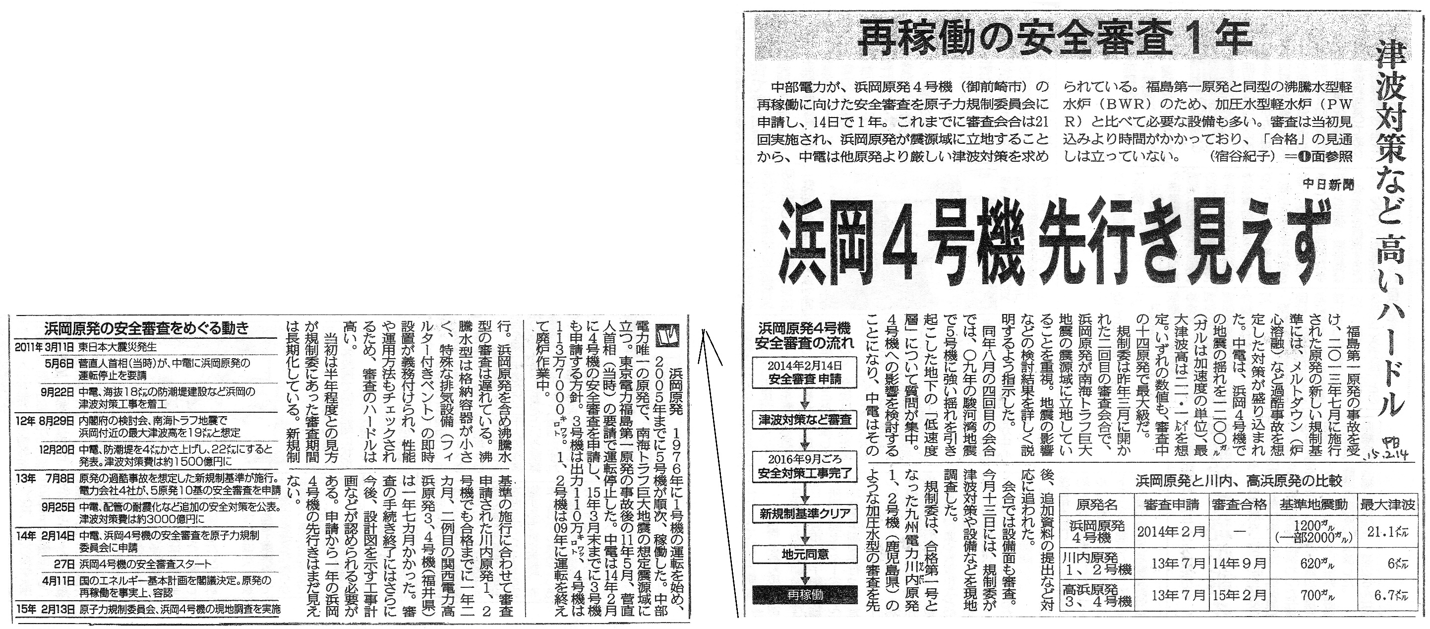 [2015_02_14_01]再稼働の安全審査1年 津波対策など 高いハードル 浜岡4号機 先行き見えず(中日新聞2015年2月14日)
