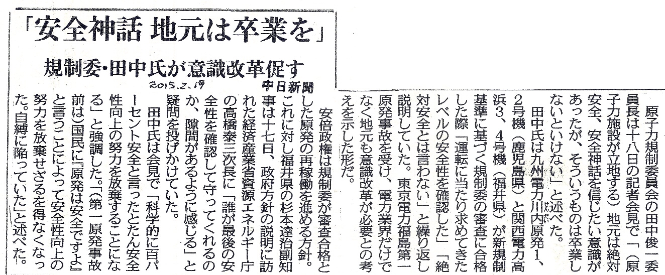 [2015_02_19_01]「安全神話 地元は卒業を」 規制委・田中氏が意識改革促す(中日新聞2015年2月19日)
