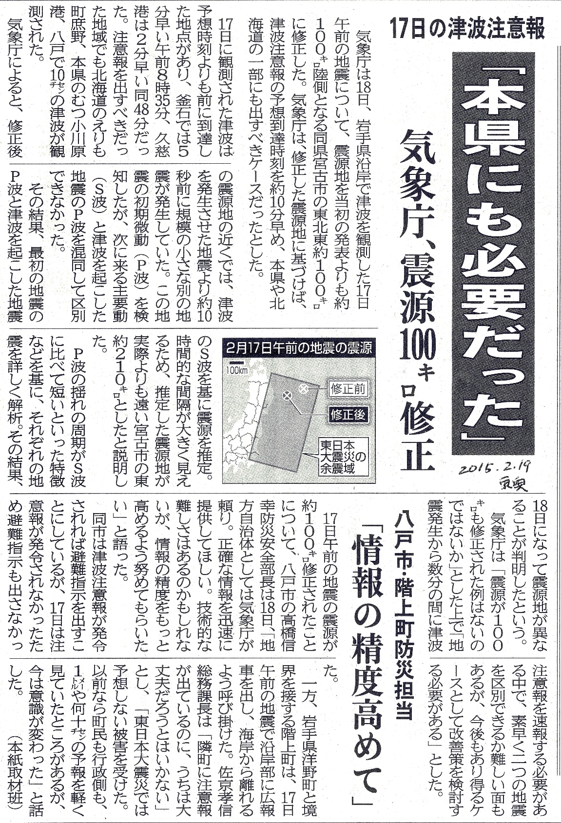 | [2015_02_19_02]17日の津波注意報 「本県にも必要だった」 気象庁、震源100キロ修正 八戸市・階上町防災担当 「情報の精度高めて」(東奥日報2015年2月19日) |