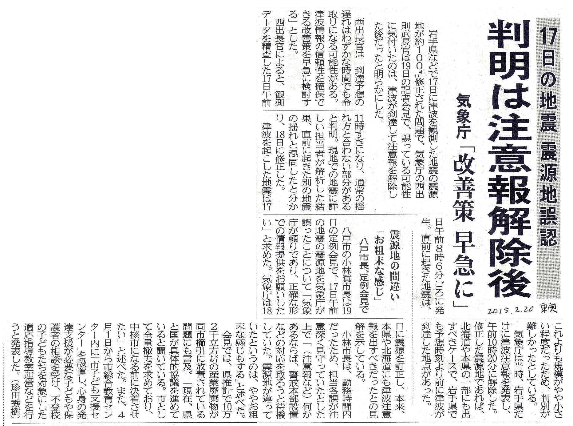 | [2015_02_20_01]17日の地震 震源地誤認 判明は注意報解除後 気象庁「改善策 早急に」 震源地の間違い 「お粗末な感じ」 八戸市長、定例会見で(東奥日報2015年2月20日) |