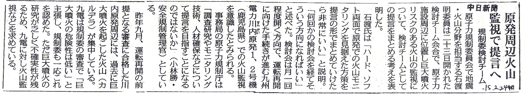 [2015_02_24_01]原発周辺火山 監視で提言へ 規制委検討チーム(中日新聞2015年2月24日)
