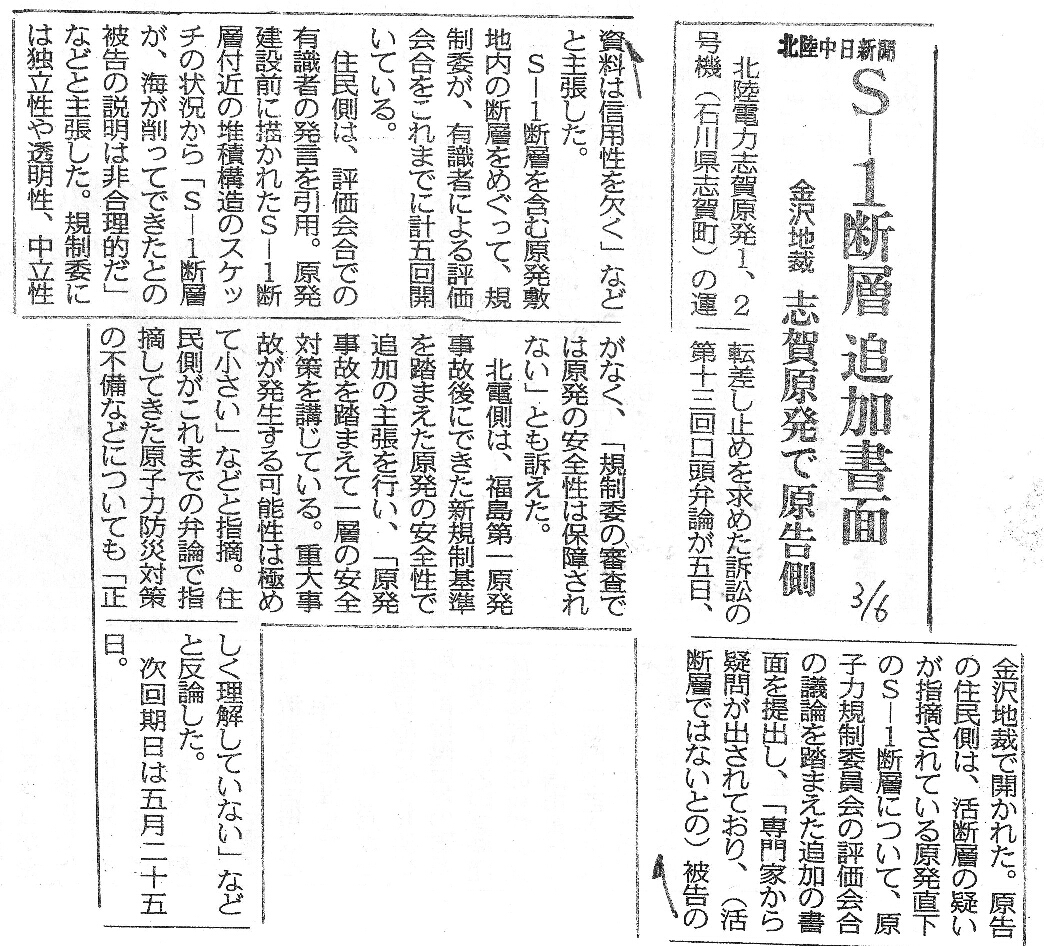 | [2015_03_06_01]S-1断層 追加書面 金沢地裁 志賀原発で原告側(北陸中日新聞2015年3月6日) |