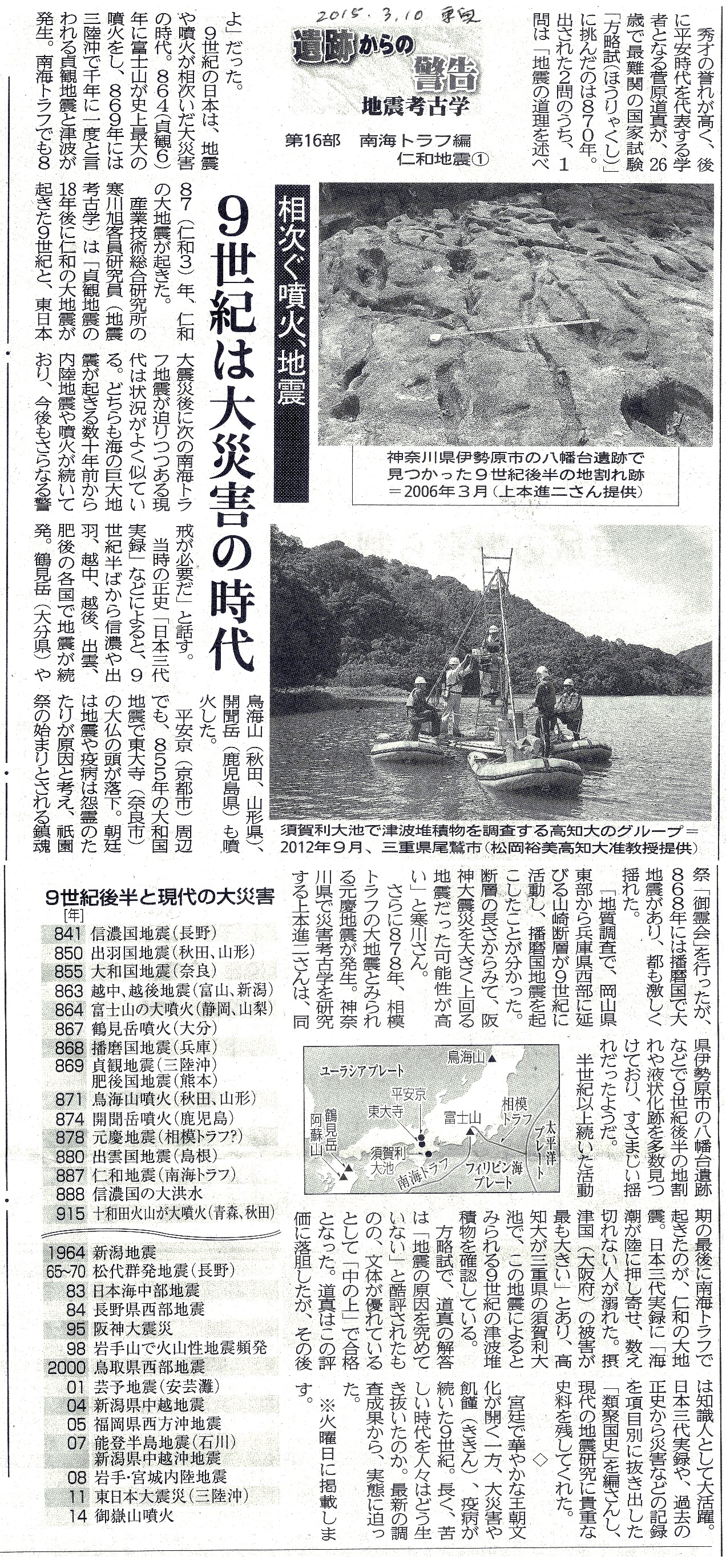[2015_03_10_01]遺跡からの警告 地震考古学 南海トラフ編 仁和地震1 相次ぐ噴火、地震 9世紀は大災害の時代(東奥日報2015年3月10日)