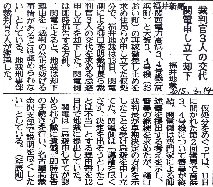 [2015_03_14_01]裁判官3人の交代 関電申し立て却下 福井地裁(福井新聞2015年3月14日)