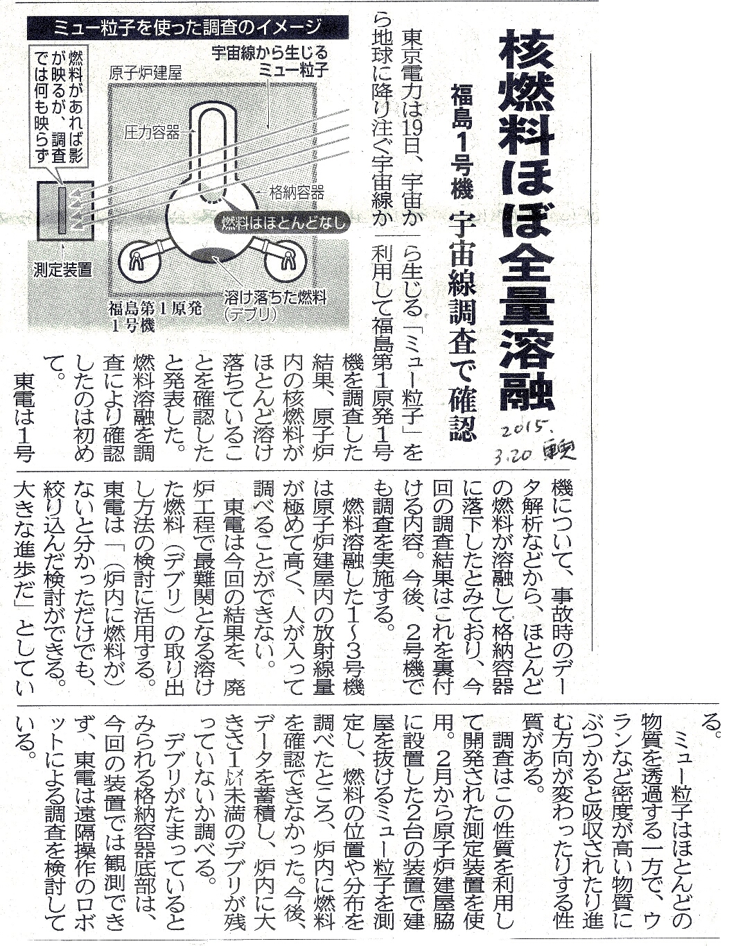 [2015_03_20_01]核燃料ほぼ全量溶融 福島1号機 宇宙線調査で確認(東奥日報2015年3月20日)