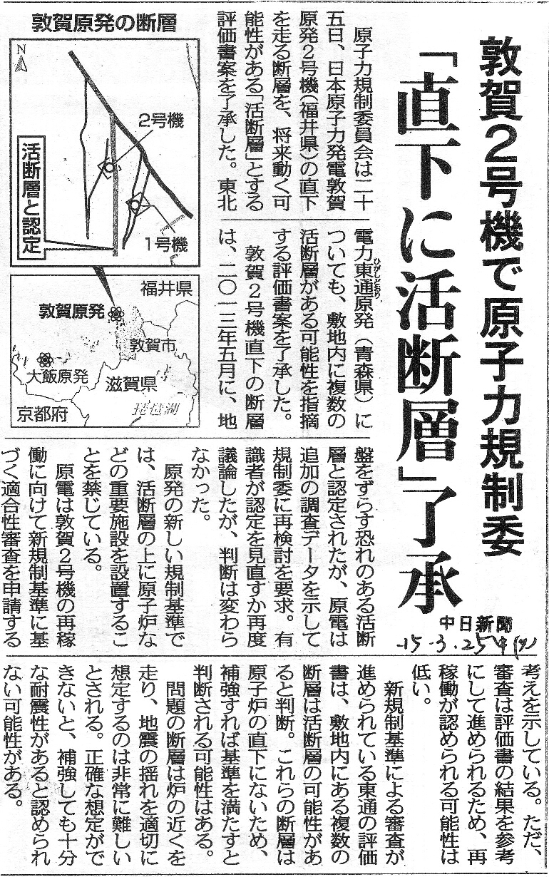 | [2015_03_25_01]敦賀2号機で原子力規制委 「直下に活断層」了承(中日新聞2015年3月25日) |