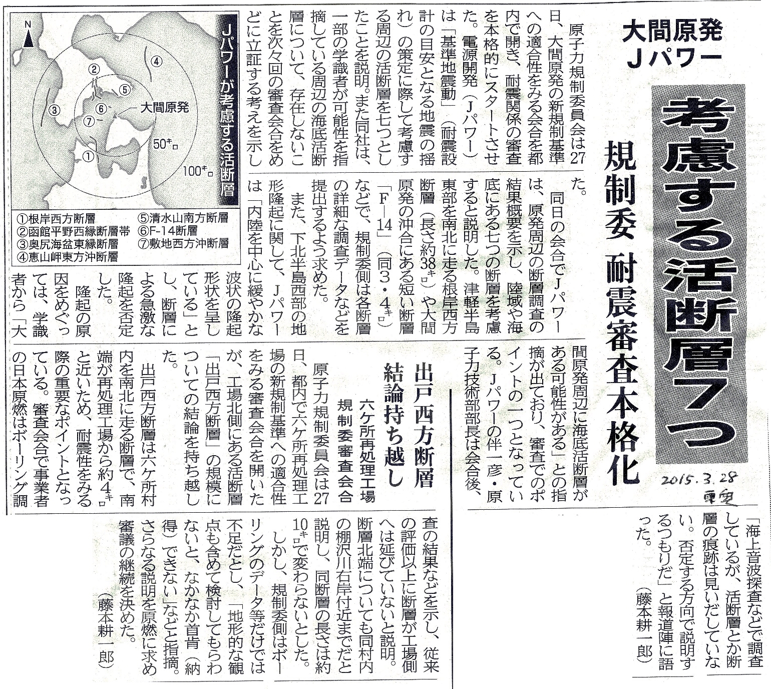 | [2015_03_28_02]大間原発Jパワー 考慮する活断層7つ 規制委 耐震審査本格化 出戸西方断層結論持ち越し 六ヶ所再処理工場規制委審査会合(東奥日報2015年3月28日) |