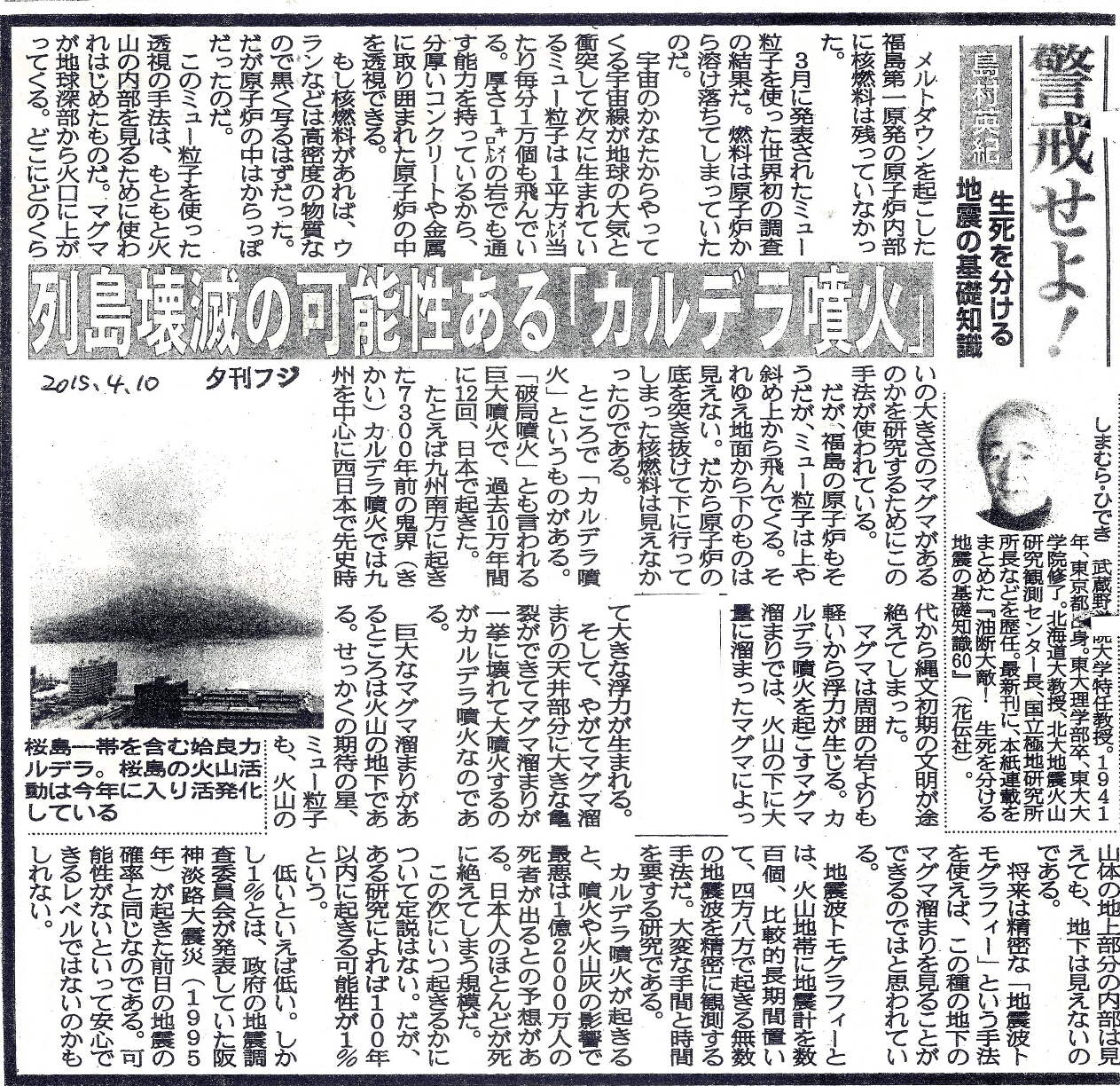 | [2015_04_10_01]警戒せよ! 島村英紀 生死を分ける地震の基礎知識 列島壊滅の可能性ある「カルデラ噴火」(夕刊フジ2015年4月10日) |