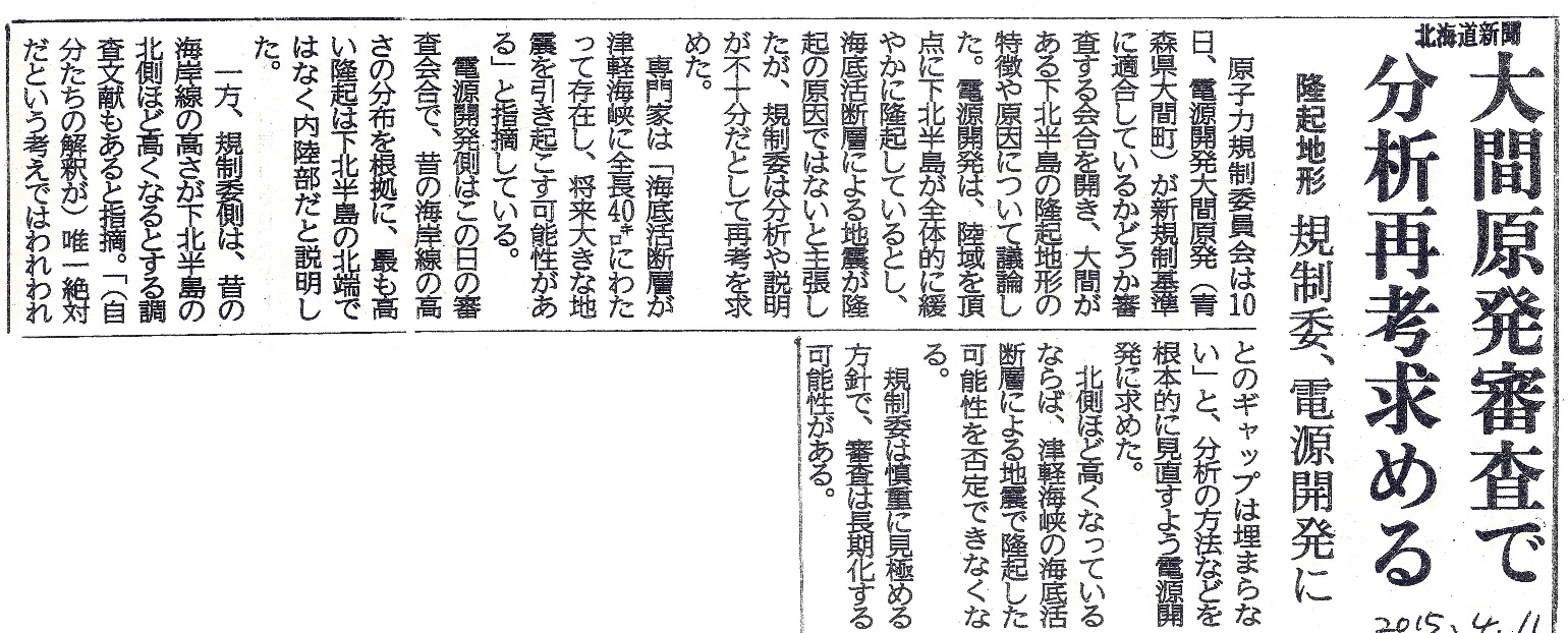 | [2015_04_11_01]大間原発審査で分析再考求める 隆起地形 規制委、電源開発に(北海道新聞2015年4月11日) |