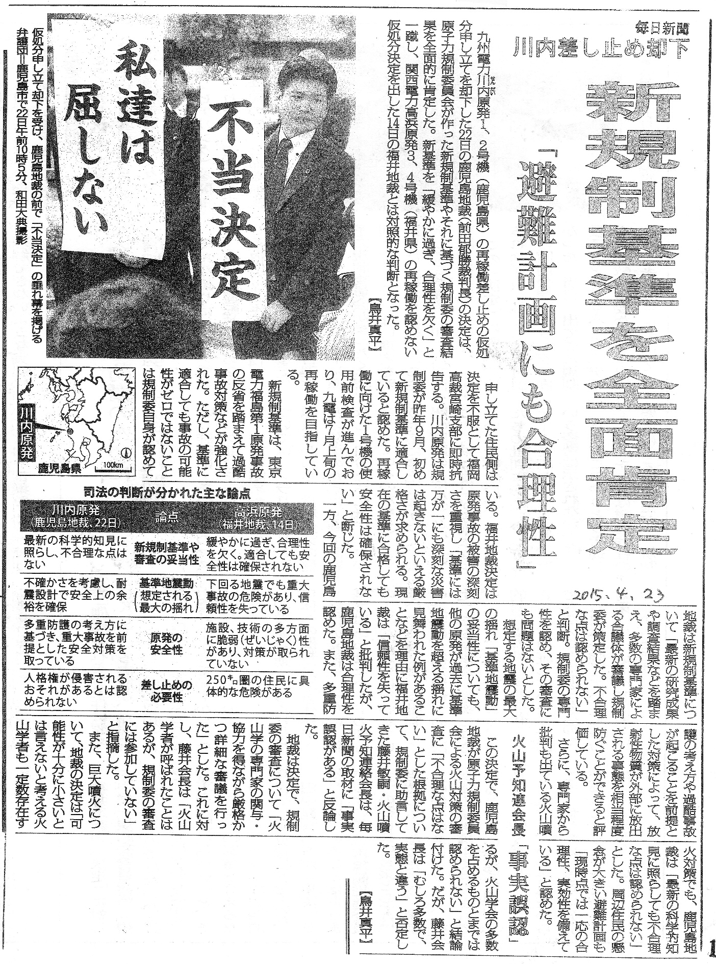 [2015_04_23_01]川内差し止め却下 新規制基準を全面肯定 「避難計画にも合理性」(毎日新聞2015年4月23日)