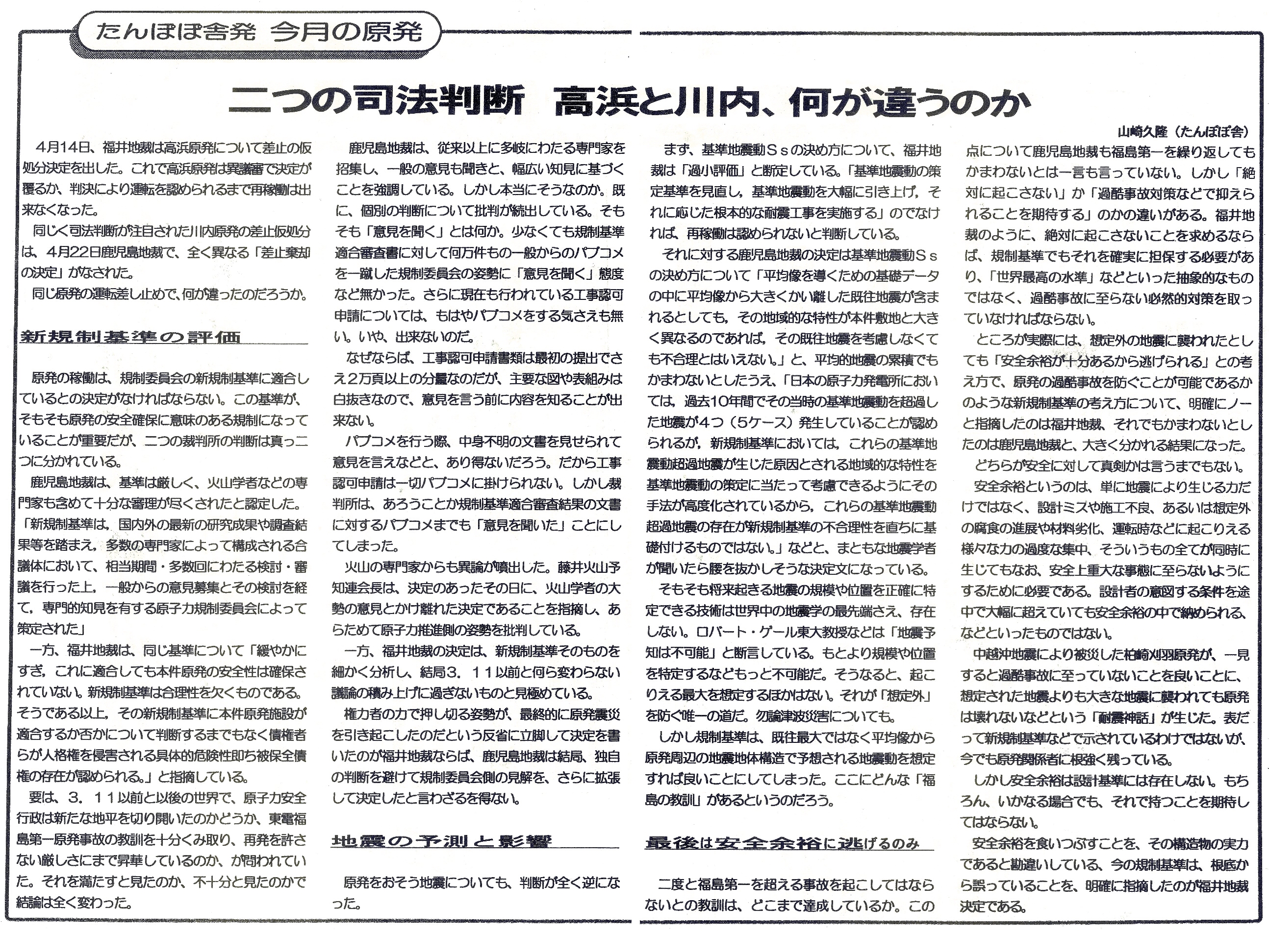 | [2015_04_30_01]二つの司法判断 高浜と川内、何が違うのか(よせあつめ新聞2015年4月30日) |