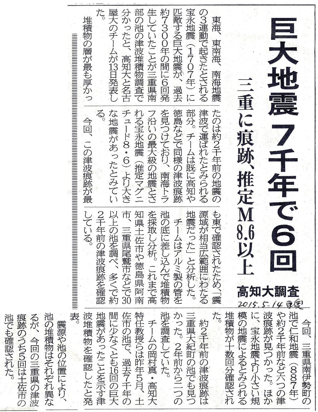 [2015_05_14_02]巨大地震 7千年で6回(東奥日報2015年5月14日)