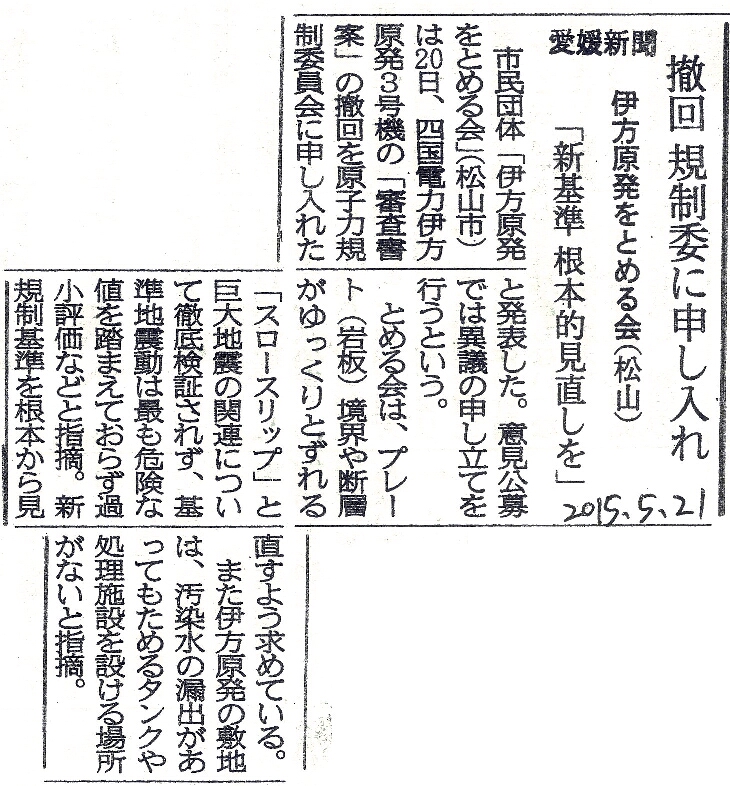 [2015_05_21_01]撤回 規制委に申し入れ 伊方原発をとめる会松山 「新基準 根本的見直しを」(愛媛新聞2015年5月21日)