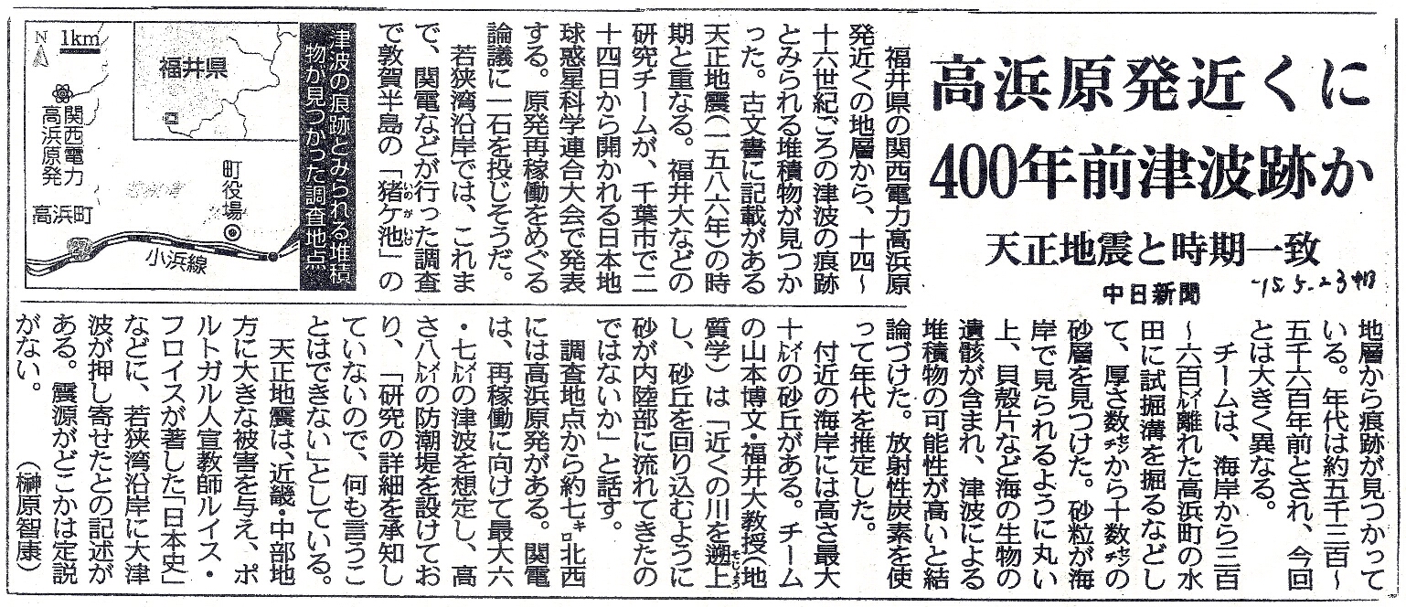 | [2015_05_23_01]高浜原発近くに400年前津波跡か 天正地震と時期一致(中日新聞2015年5月23日) |