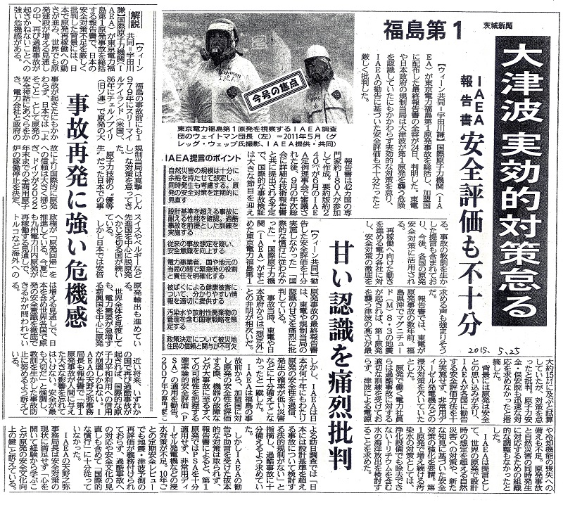 | [2015_05_25_01]福島第1 大津波 実効的対策怠る IAEA報告書 安全評価も不十分 甘い認識を痛烈批判 事故再発に強い危機感(茨城新聞2015年5月25日) |