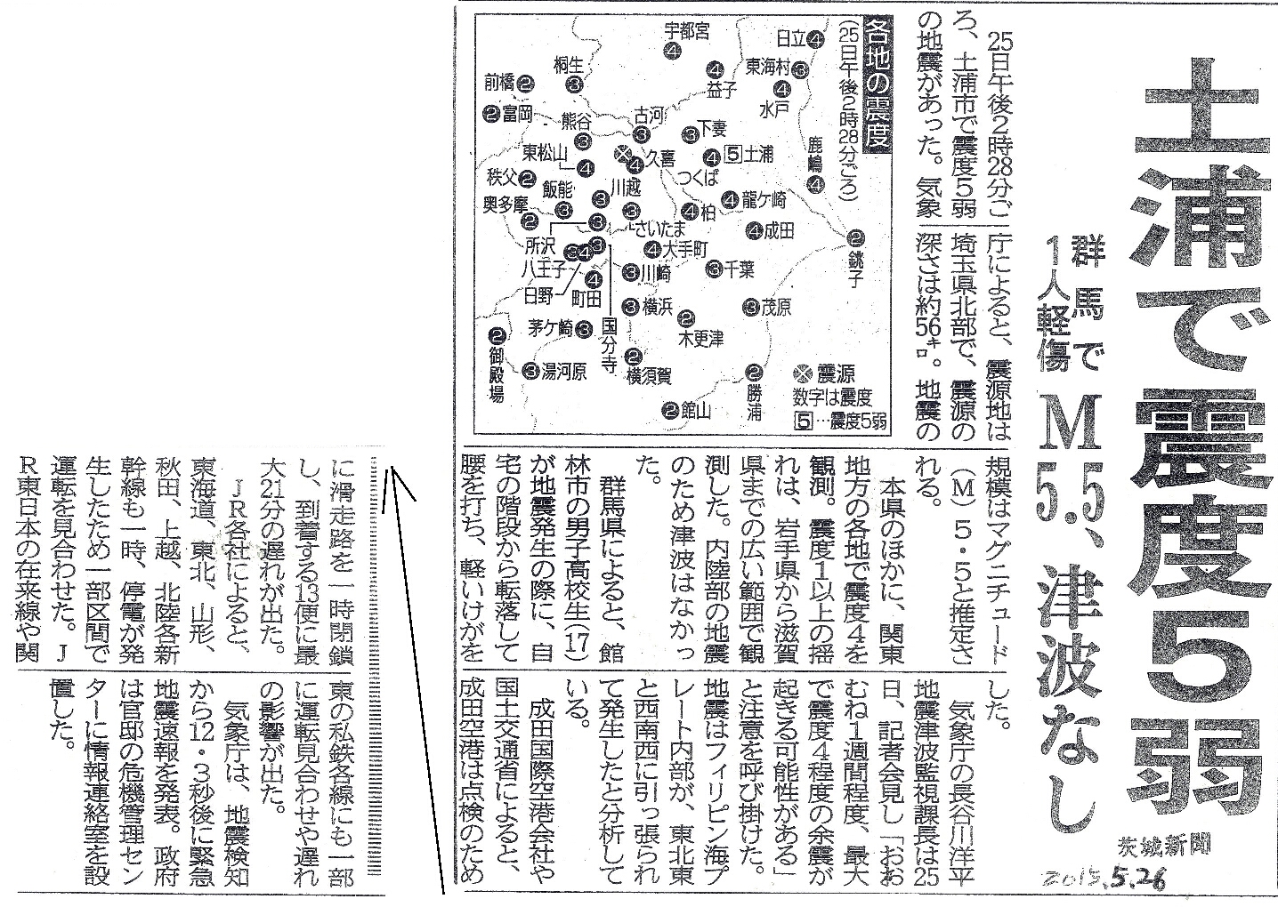 [2015_05_26_01]土浦で震度5弱 群馬で1人軽傷 M5.5、津波なし(茨城新聞2015年5月26日)