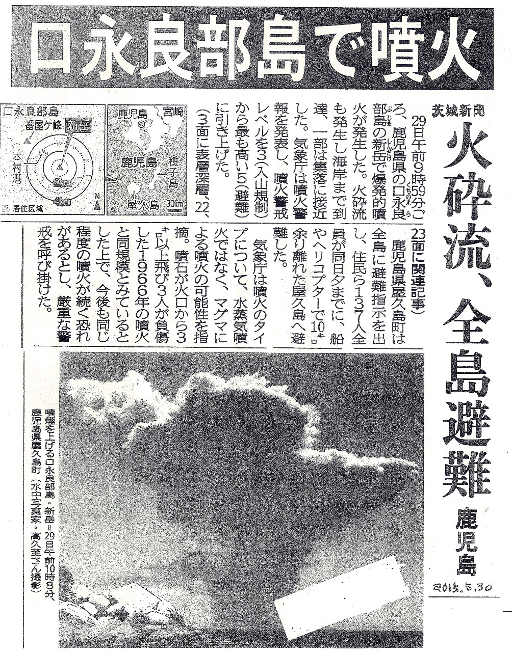 [2015_05_30_02]口永良部島で噴火 火砕流、全島避難 鹿児島(茨城新聞2015年5月30日)