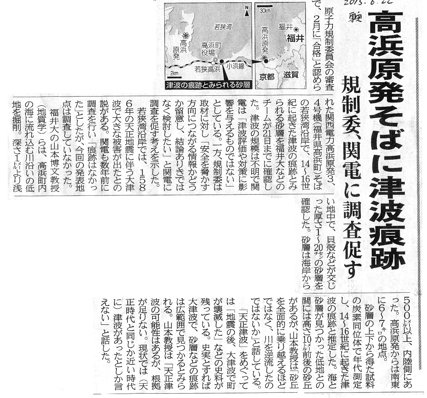 | [2015_06_22_01]高浜原発そばに津波痕跡 規制委、関電に調査促す(東奥日報2015年6月22日) |
