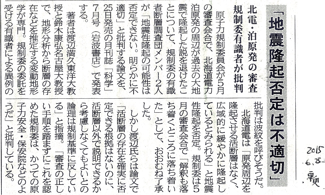 | [2015_06_25_02]「地震隆起否定は不適切」 北電・泊原発の審査 規制委有識者が批判(東奥日報2015年6月25日) |