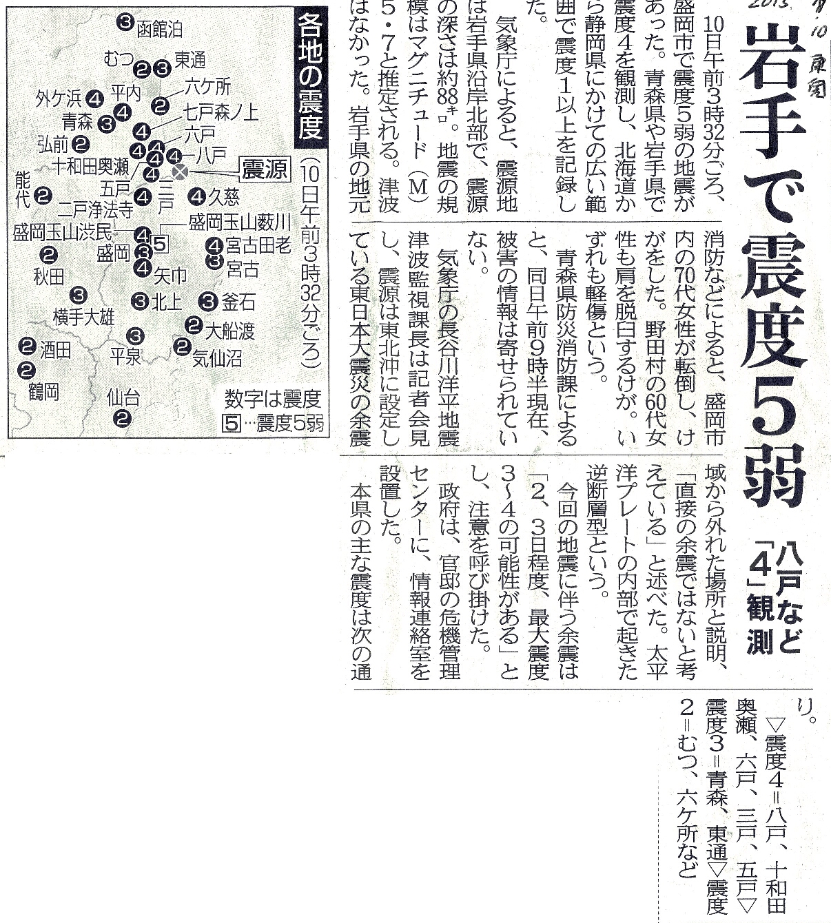 [2015_07_10_01]岩手で震度5弱 八戸など「4」観測 (東奥日報2015年7月10日)