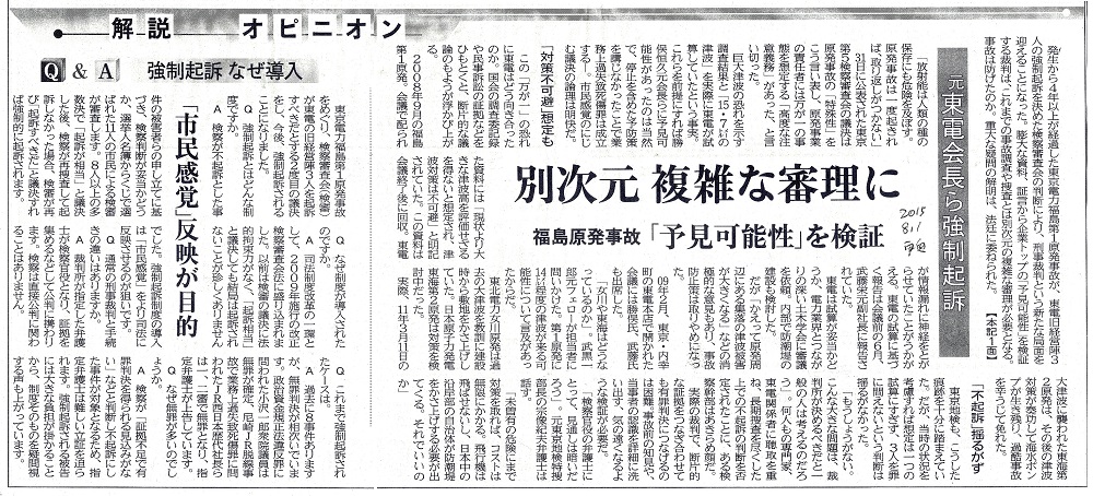 | [2015_08_01_01]解説 オピニオン 元東電会長ら強制起訴 別次元 複雑な審理に 福島原発事故 「予見可能性」を検証 Q&A 強制起訴なぜ導入 「市民感覚」反映が目的(東奥日報2015年8月1日) |