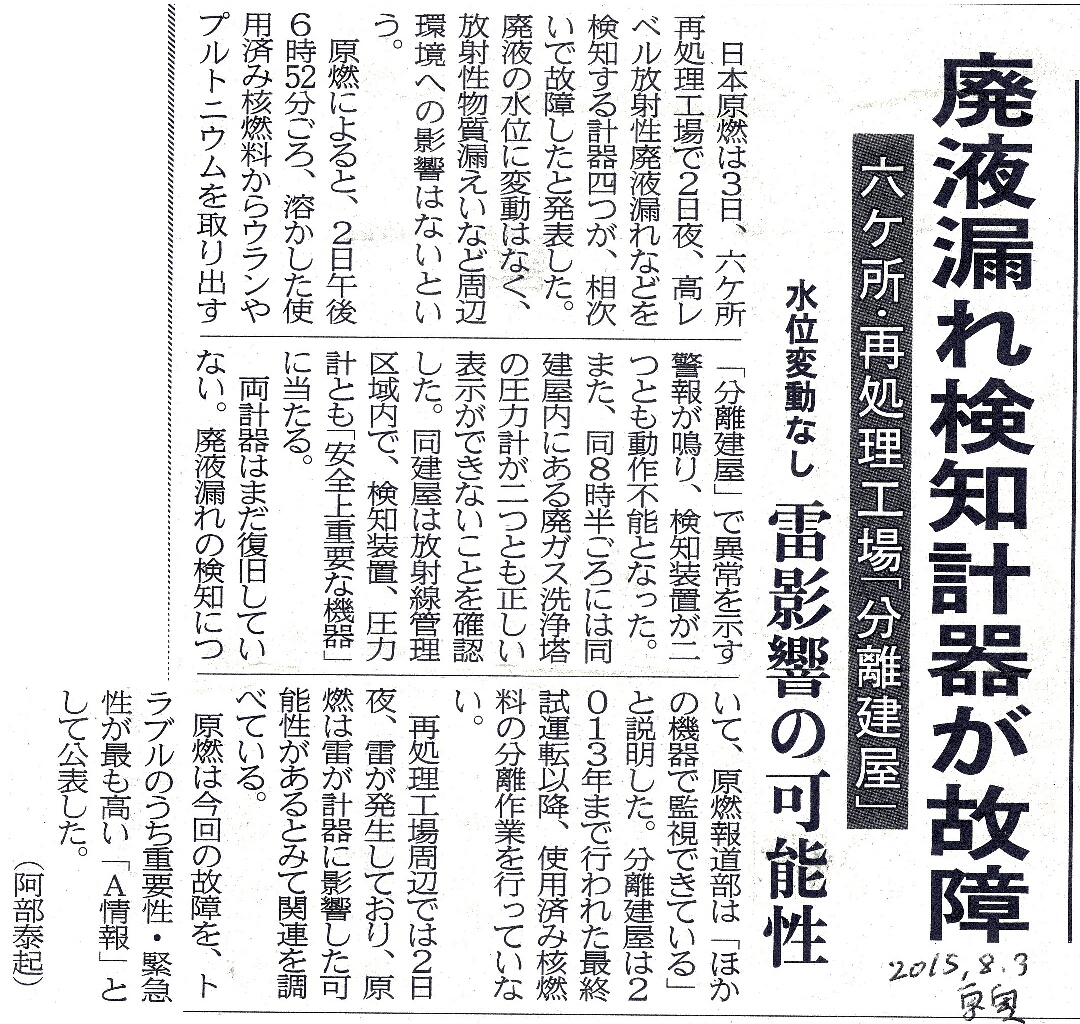 | [2015_08_03_01]廃液漏れ検知計器が故障 六ヶ所・再処理工場「分離建屋」 水位変動なし 雷影響の可能性(東奥日報2015年8月3日) |