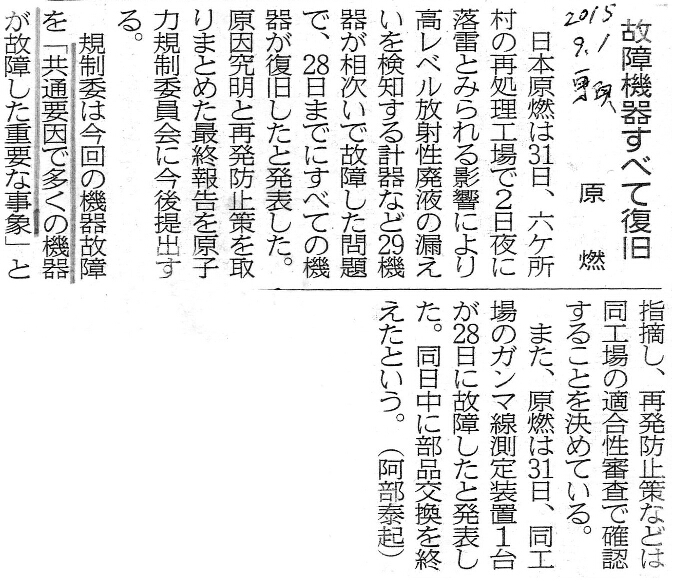 | [2015_09_01_01]故障機器すべて復旧 原燃 (東奥日報2015年9月1日) |