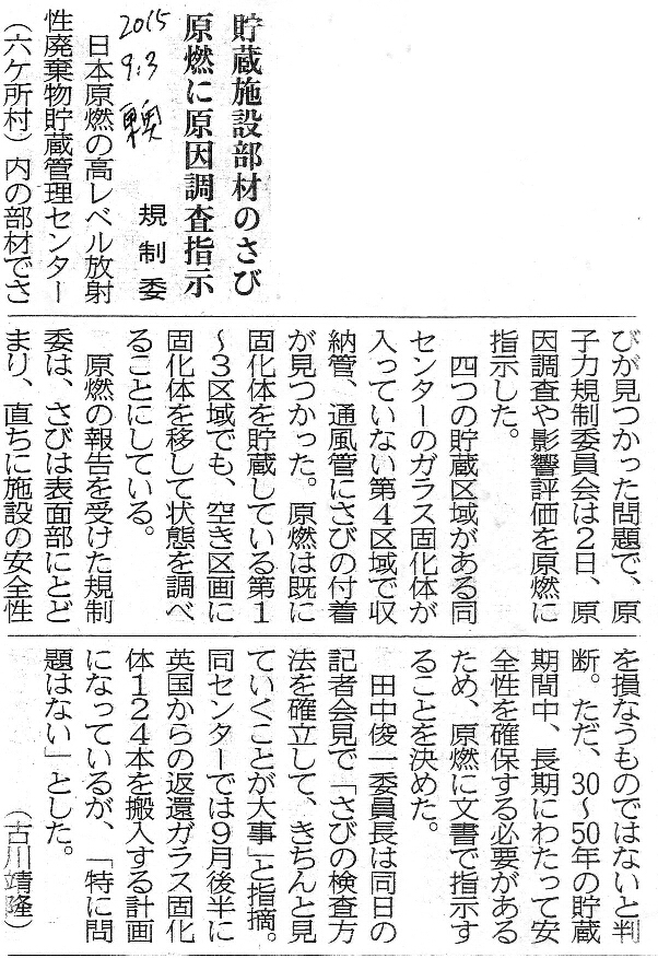 | [2015_09_03_01]貯蔵施設部材のさび 原燃に原因調査指示 規制委 (東奥日報2015年9月3日) |