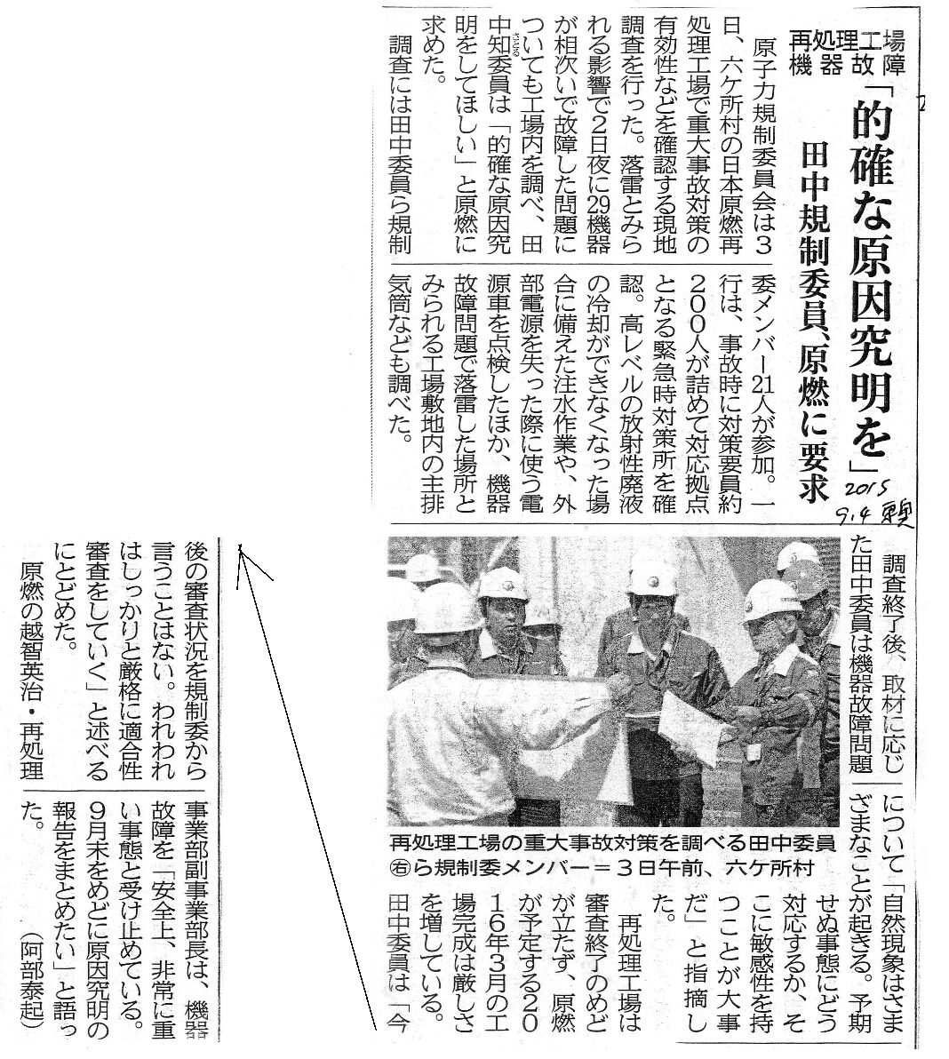 | [2015_09_04_01]再処理工場機器故障 「的確な原因究明を」 田中規制委員、原燃に要求 (東奥日報2015年9月4日) |