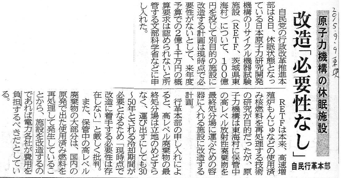 [2015_09_09_01]原子力機構の休眠施設 改造「必要性なし」 (東奥日報2015年9月9日)