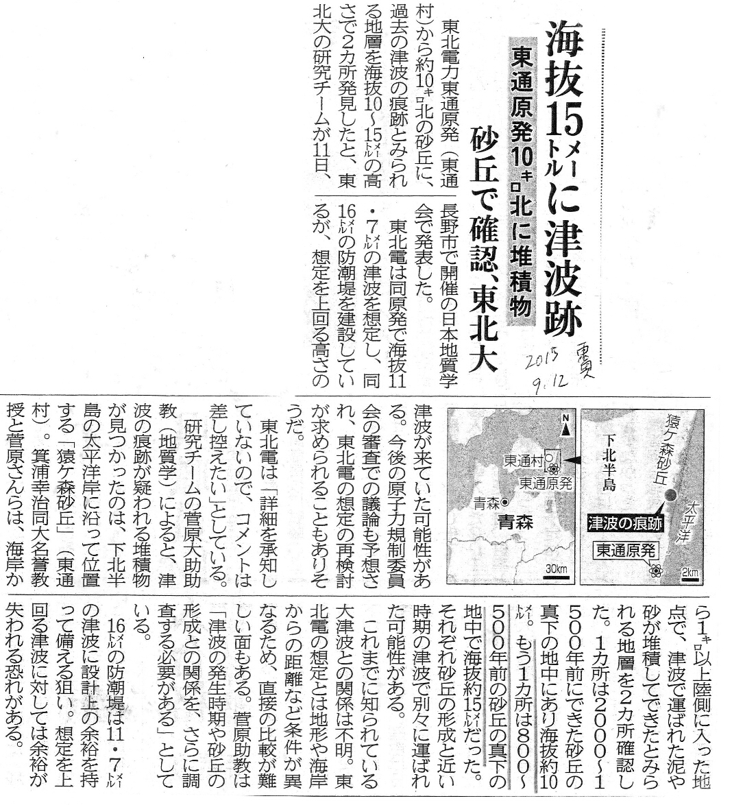 | [2015_09_12_01]海抜15メートルに津波跡 東通原発10キロ北に堆積物 砂丘で確認、東北大 (東奥日報2015年9月12日) |