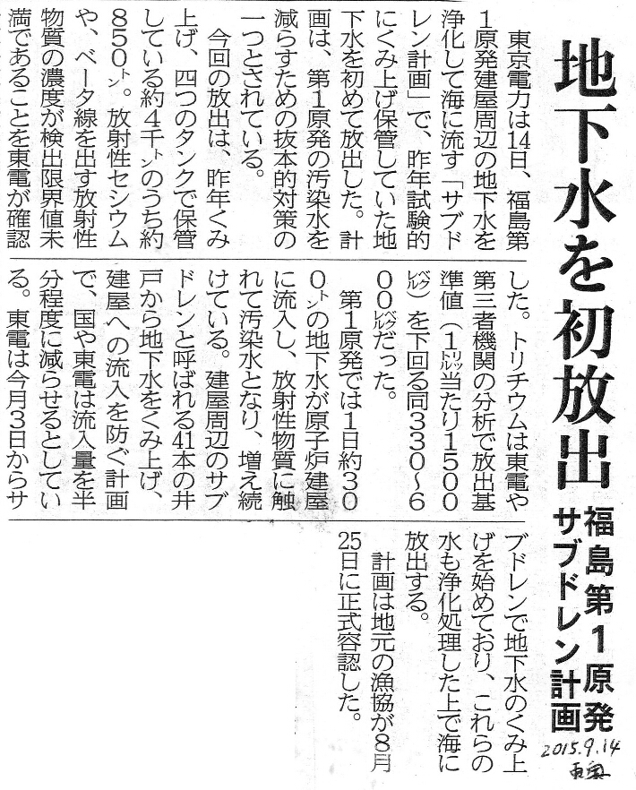| [2015_09_14_01]地下水を初放出 福島第1原発サブドレン計画 (東奥日報2015年9月14日) |