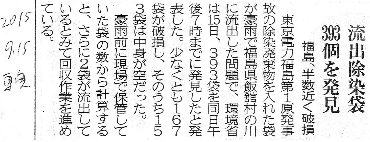 [2015_09_15_01]流出除染袋 393個を発見 福島、半数近く破損 (東奥日報2015年9月15日)