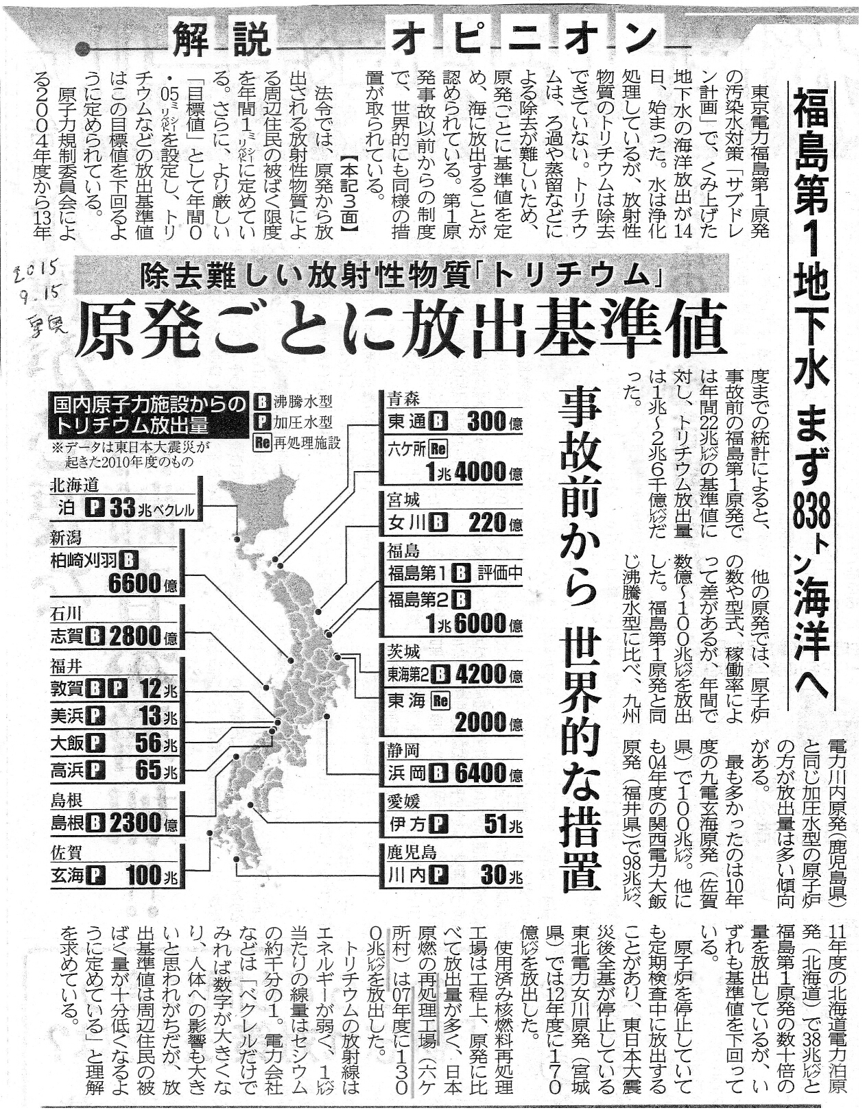 | [2015_09_15_02]解説 オピニオン 福島第1地下水 まず838トン海洋へ 除去難しい放射性物質「トリチウム」 原発ごとに放出基準値 事故前から 世界的な措置 (東奥日報2015年9月15日) |