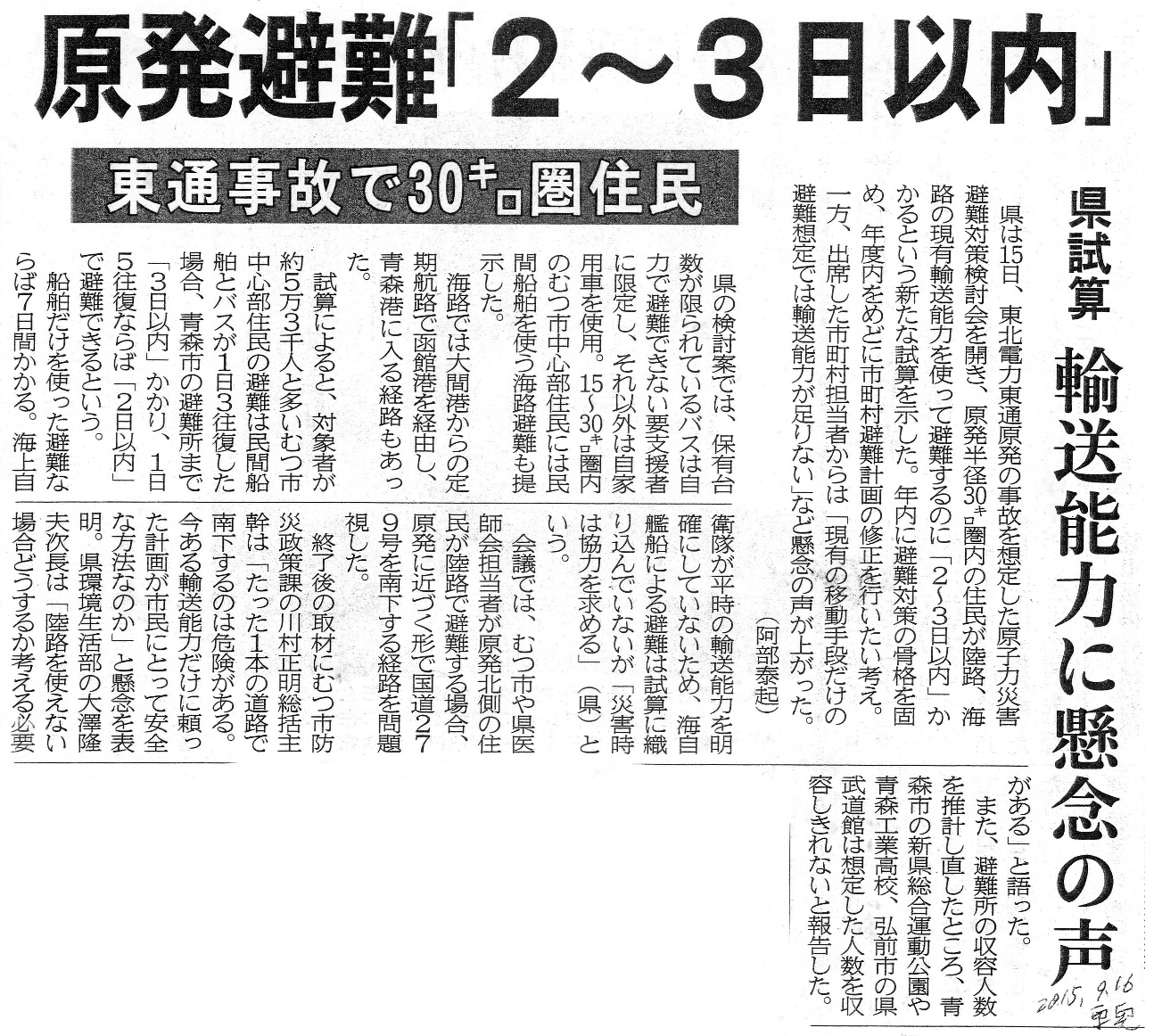 | [2015_09_16_01]原発避難「2〜3日以内」東通事故で30キロ圏住民 県試算 輸送能力に懸念の声 (東奥日報2015年9月16日) |