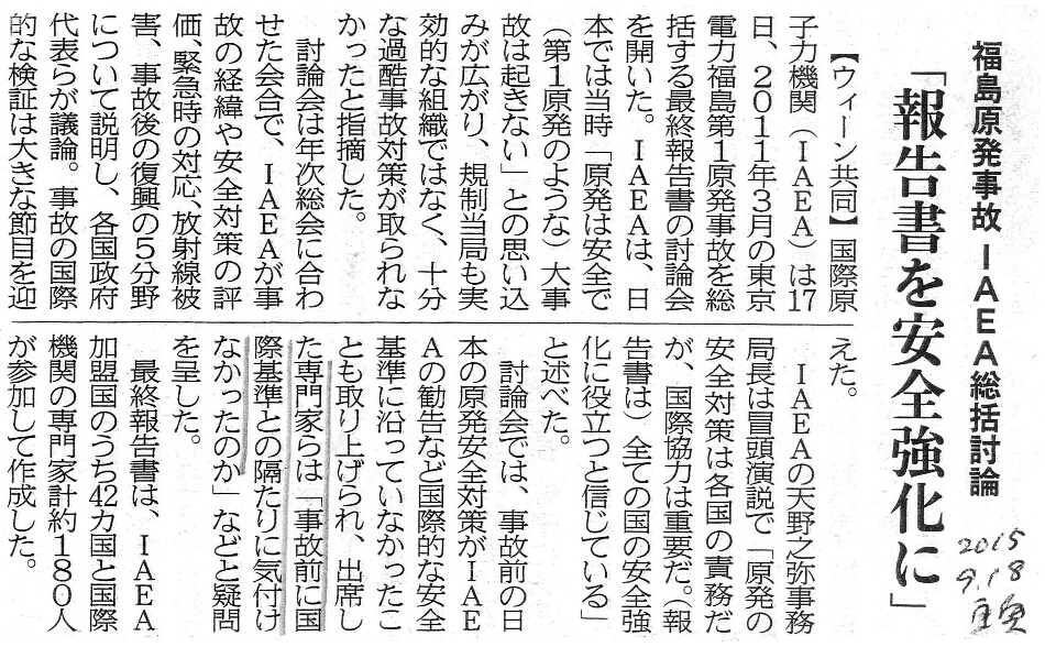 [2015_09_18_01]福島原発事故 IAEA総括討論 「報告書を安全強化に」 (東奥日報2015年9月18日)