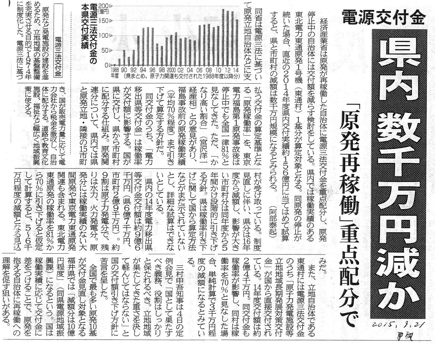 [2015_09_21_01]電源交付金 県内 数千万円減か 「原発再稼働」重点配分で (東奥日報2015年9月21日)