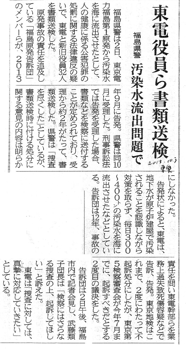| [2015_10_03_01]東電役員ら書類送検 福島県警 汚染水流出問題で (東奥日報2015年10月3日) |